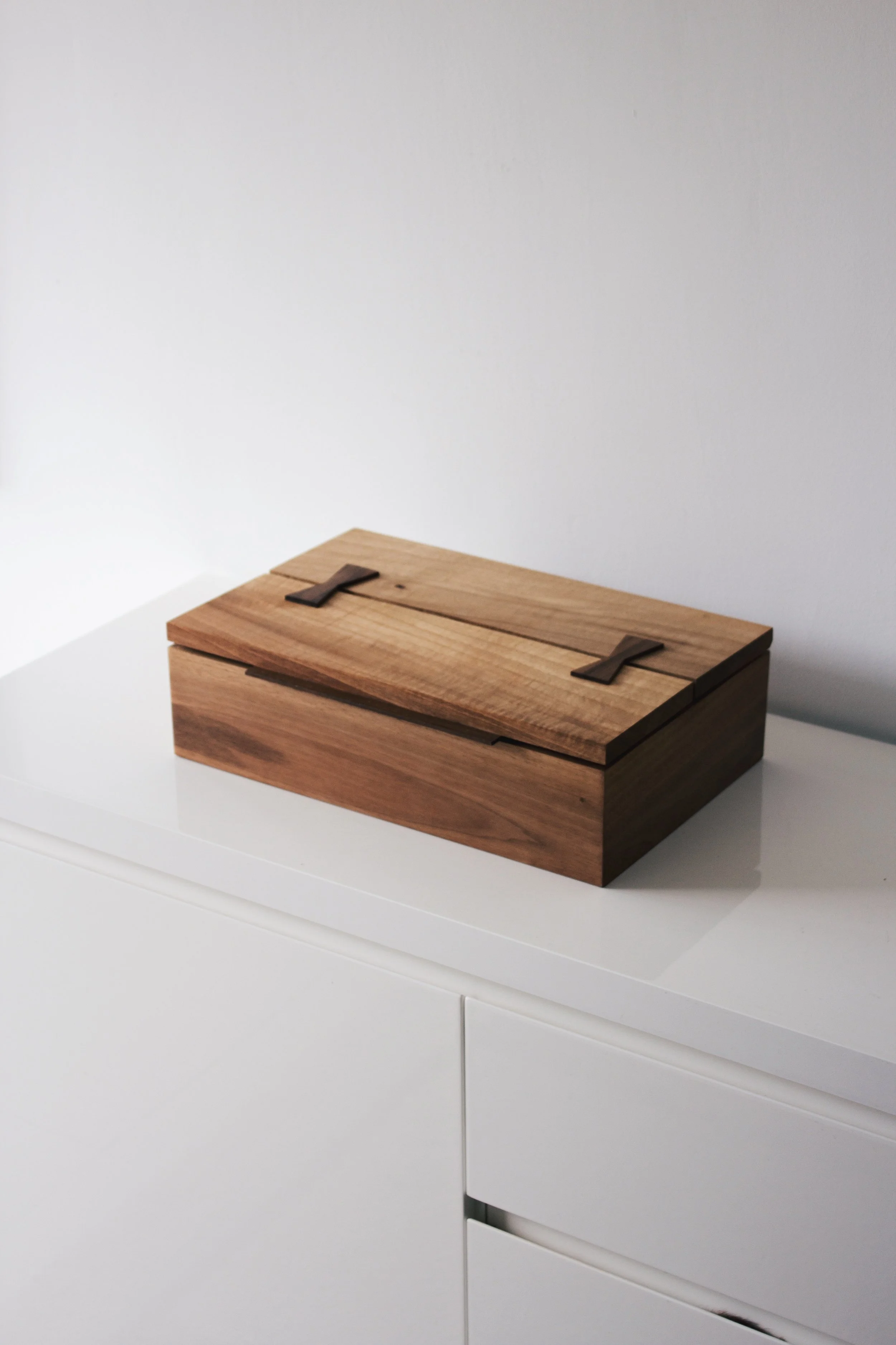 Wood and leather watch box for the storage and presentation of watches. Designed and hand-crafted with traditional woodworking techniques.